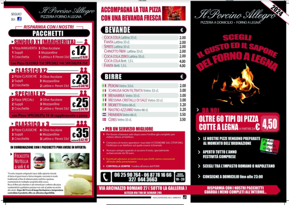 Il porcino allegro ti offre una varietà di pizze, grazie al suo ricco e gustoso menu, all’interno del quale puoi scegliere tra deliziosi e convenienti pacchetti: Singolo, Classico, Speciale, Classico per 3. Ciascuno garantisce qualità e convenienza, potendo affiancare alle nostre pizze anche squisiti contorni, come olive ascolane, mozzarelline, supplì, crocchette e bevande a scelta.